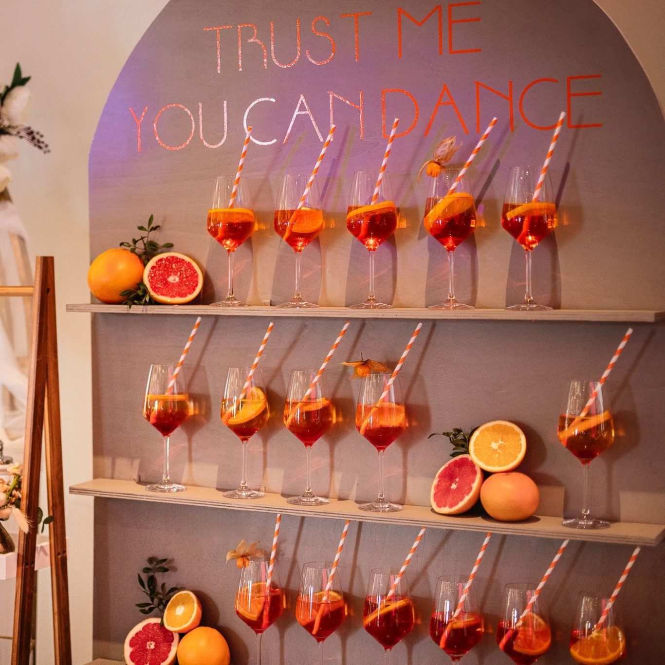 Unsere Aperitif Wall sorgt für prickelnde Momente und feine Drinks - mit dem Motto "TRUST ME YOU CAN DANCE" wird jeder Schluck zum Auftakt für gute Laune, Tanz und unvergessliche Augenblicke.