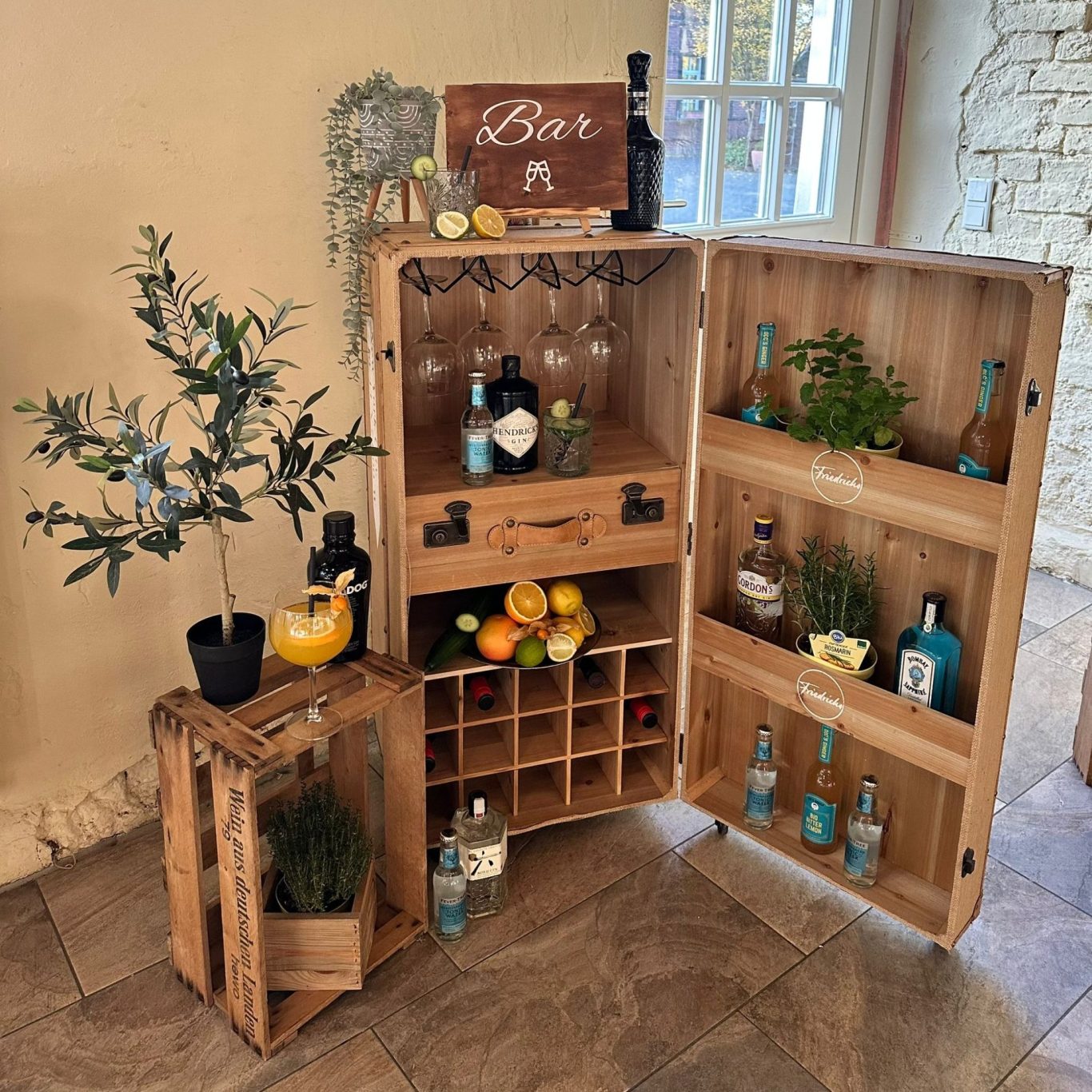 Aufgeklappt wird aus dem stilvollen Vintage-Koffer eine charmante Bar, die sofort neugierig macht, Gespräche startet und eure Gäste ganz automatisch anzieht.